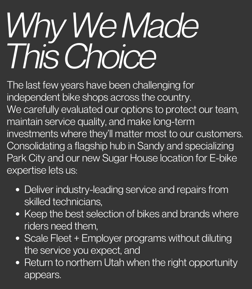 This is a bittersweet moment and we’re sad to pause our presence in Sunset. We're grateful for the memories and relationships there, and excited about the future. Our vision includes a stronger flagship in Sandy, specialized support in Park City and our new Sugar House space, and an even better service experience across the board. Thank you for supporting Bingham Cyclery.
